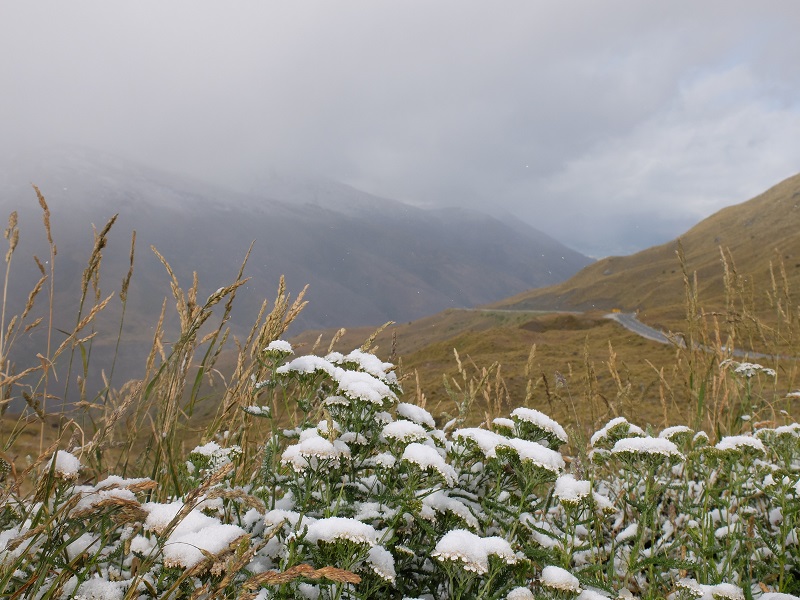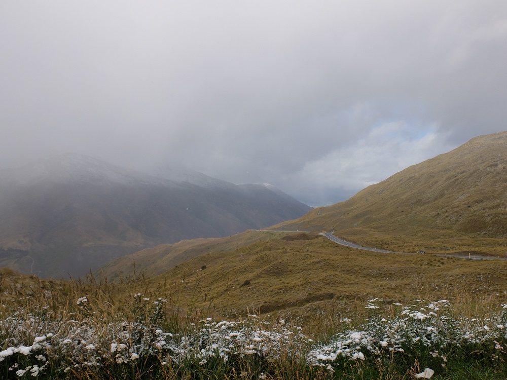 We left Wanaka and started towards Milford Sound via the Crown Pass. We were slightly apprehensive about heading over the pass due to the fact that it had snowed overnight and it would be our first real test of the van on NZ roads. It was slow going but, other than squeaky windscreen wipers battling with a shower of snow, we made it without any dramas. We had a celebratory stop at the top of the pass to take in the amazing view down the valley towards Lake Wakatipu and Queenstown.