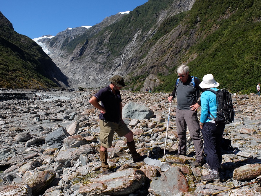 I’d been to Franz Josef with Ali back in 1993 when we were on our gap year and we had been on a really great guided walk on the glacier. I had imagined that we would do something similar this time round. We found out however that due to the glacier being in a period of retreat its snout was too unstable and walks on the ice had been stopped 3 years ago. We decided to do a 2 hour guided walk in the morning that would take us up alongside the glacier and slightly off the main tourist track. The walk was led by Tim a strapping Yorkshire man, ex British Army and head of the volunteer ambulance service for Franz Josef. Mum and I felt we were in very safe hands! We were also happy to find that we were the only people in the group so we got to ask lots of questions.