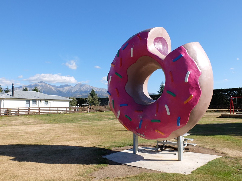 We ended up in the little town of Springfield a few hours east of Arthurs Pass. The top attraction in the town seemed to be a garish pink Simpson’s style donut in the kids play park, that and the pub of course! We found the campsite, a basic but well maintained site run by a charming man with one leg and a cat.