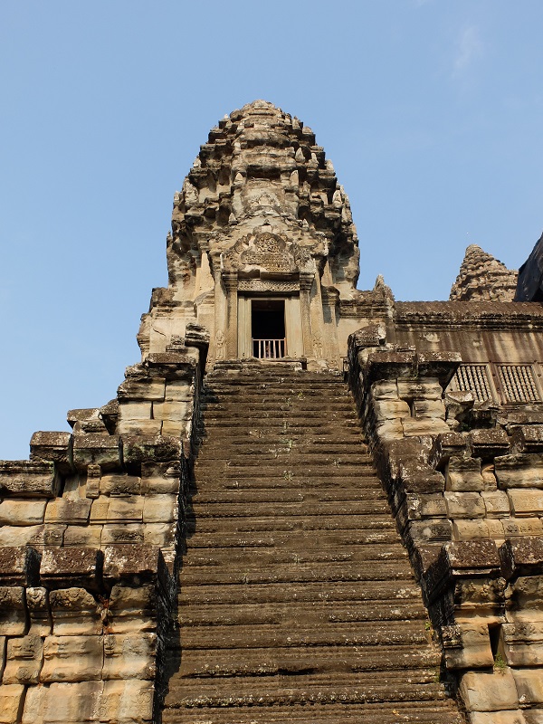 Steps up towards one of the towers at Angkor Wat. The steps are shallow and very steep resulting in a slow ascent, with a bowed head, to show reverence.