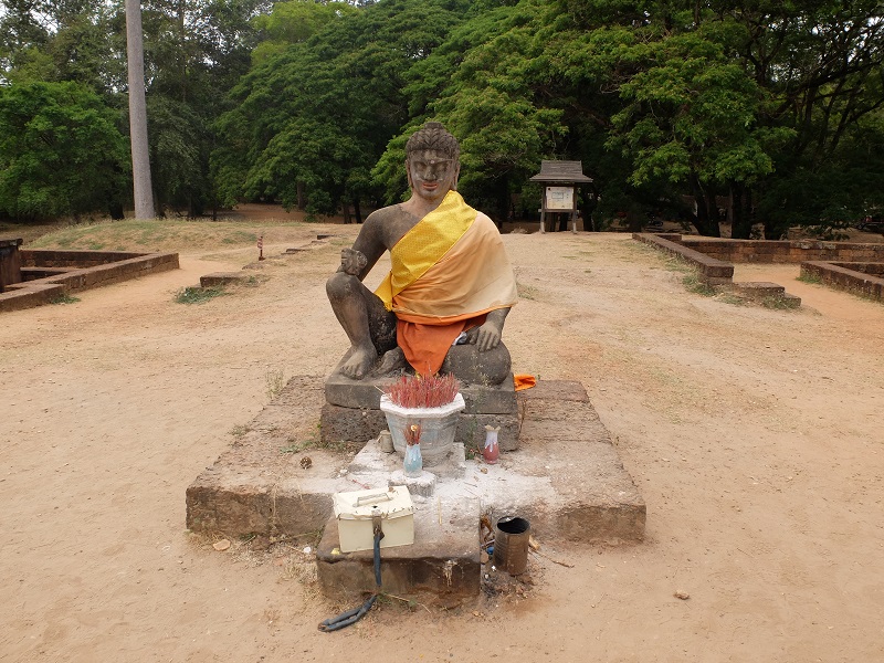An carving of the Buddha that was modified from a carving of an apsara. Many of the temples at Angkor changed from Buddhist to Hindi temples or vice versa depending on the ruling King.
