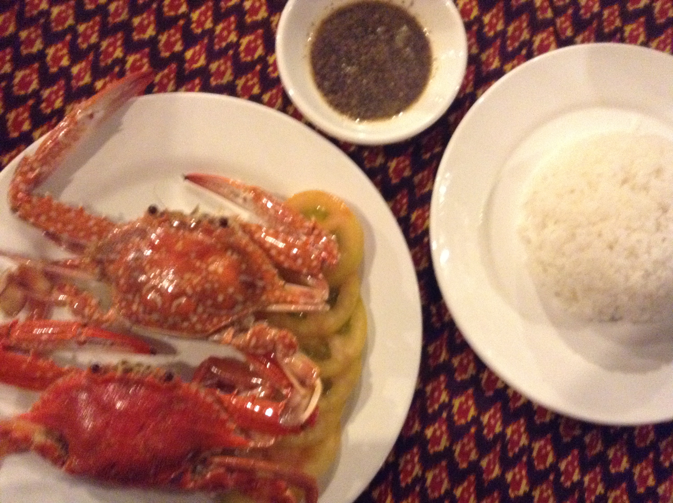 A quick note on the crab. One night I had the Khmer stir fried crab with green peppercorns. The crab is partly pre-smashed*, comes in a beautiful rich green peppercorn sauce and is served with rice. I got very messy eating this and took delight in sucking every morsel of crab out of even the tiniest bits of shell I could find. I needed to be hosed down afterwards, but it was worth it! One other night I had the plain boiled crab which comes with a black pepper and lime dipping sauce. I ordered the small size but realized my mistake when I was presented with two rather small crabs. The meat was delicious, sweet and tender but wow did I have to work at it! My advice for next time would be go large on the crab as I’m pretty certain the ratio of crabmeat to effort will be much greater!